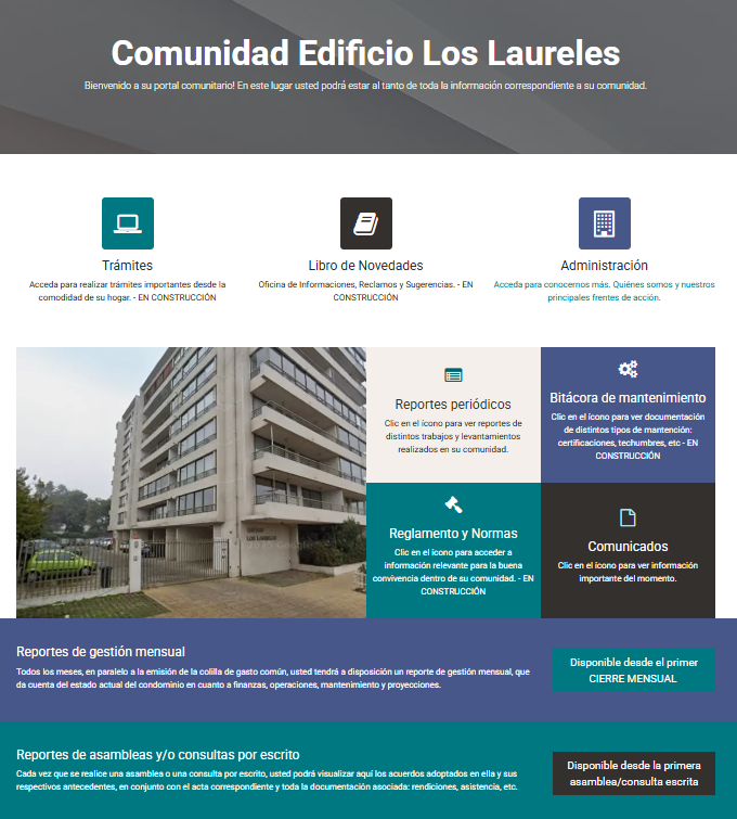 El enlace por el que están visualizando este comunicado es vuestro PORTAL COMUNITARIO. En él incluiremos en tiempo real información relevante para la comunidad: desde el mantenimiento de las distintas áreas hasta los reportes de gestión mensual y de asambleas. Además, en este portal podrán realizar un sinnúmero de trámites relacionados con la comunidad: desde la solicitud de certificados de residencia, el aviso de mudanzas hasta el envío de comprobantes de pago de gastos comunes, por mencionar algunos.